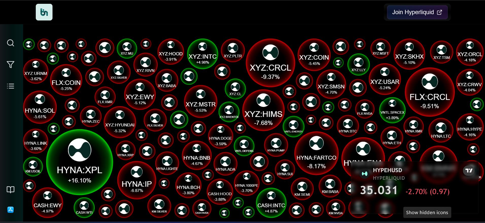 - Dynamic bubbles representing every Hyperliquid asset